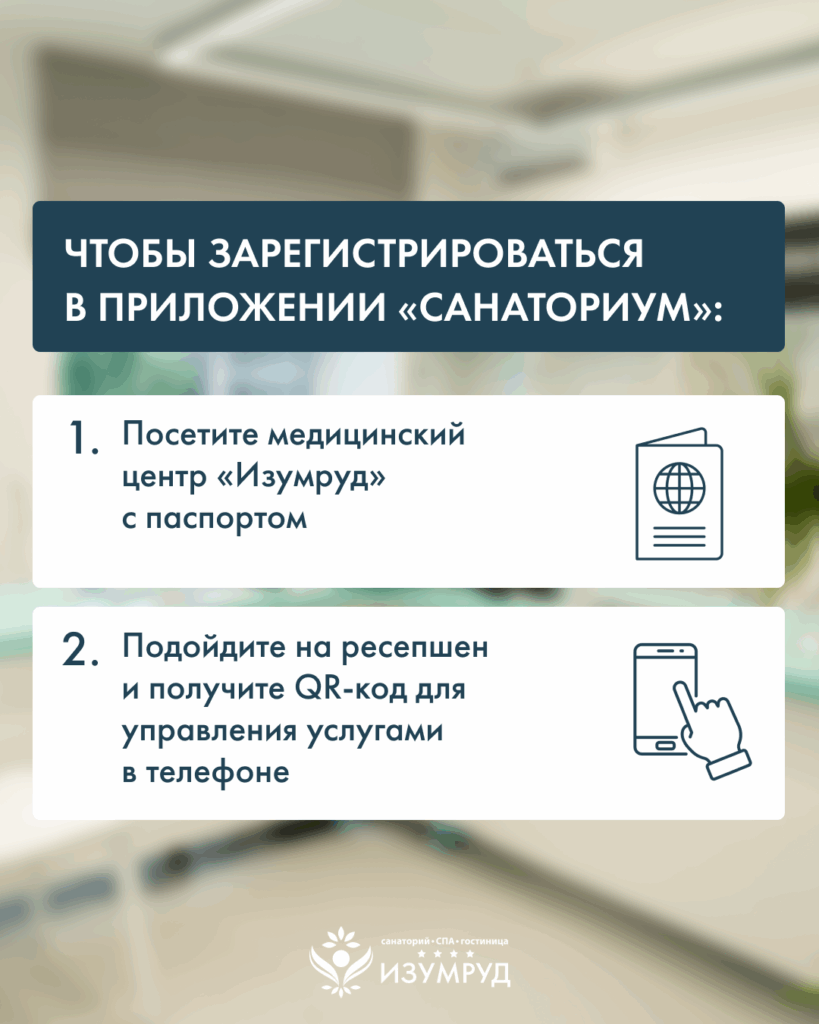 Если вы у нас впервые то всё очень просто: достаточно один раз зайти в медицинский центр «Изумруд» с документом, удостоверяющим личность. Это можно сделать во время первого приёма или даже во время прогулки по территории санаторного комплекса.
